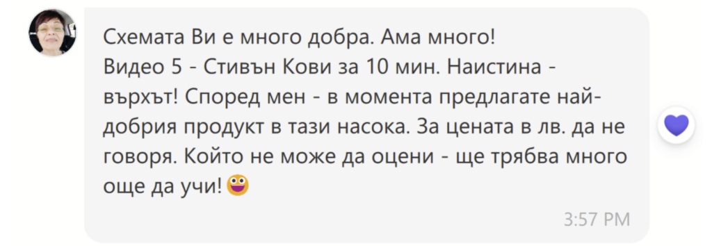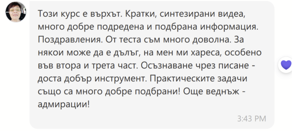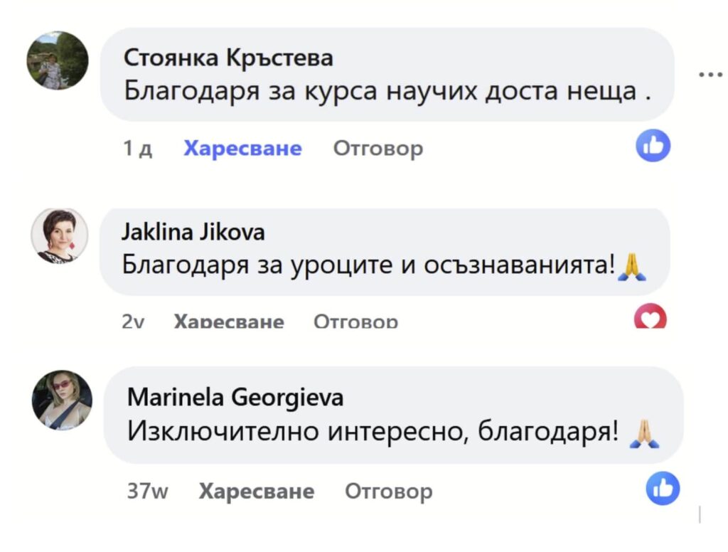 Вземи от курса практични инструменти за израстване – срещни се със своето автентично аз, научи се да изграждаш хармонични взаимоотношения и да разпознаваш ключовите уроци на всеки етап от живота си.